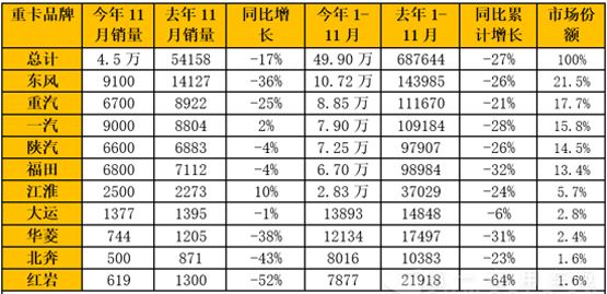 11月份的重卡市場,用幾句老調(diào)重彈的話來說就是,毫無回暖跡象、繼續(xù)低迷徘徊、情況很不樂觀……這些話雖然沒什么新意,但卻是一語中的。