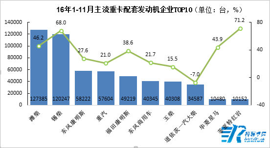 重卡配套動(dòng)力方面,從2016年1-11月份配套信息來看,配套前三的發(fā)動(dòng)機(jī)企業(yè)分別是濰柴、錫柴和東風(fēng)康明斯,累計(jì)配套量分別為12.74萬輛、12.02萬輛和5.82萬輛,同比增幅分別為46.2%、68%和27.6%。重卡配套前十的發(fā)動(dòng)機(jī)企業(yè)中,錫柴和菲亞特紅巖同比增幅超過65%,增幅較大;道依茨一汽大柴同比下降7.0%,降幅最大。
